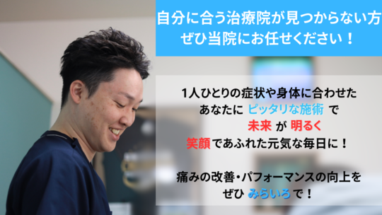 私は「このままずっと痛いのでは。」という不安をなくしたいと思っています。 身体の専門家として痛みの本質を見抜き、国家資格保持者による安心・安全で、あなたの身体に合わせたオーダーメイドな施術をお届けします。