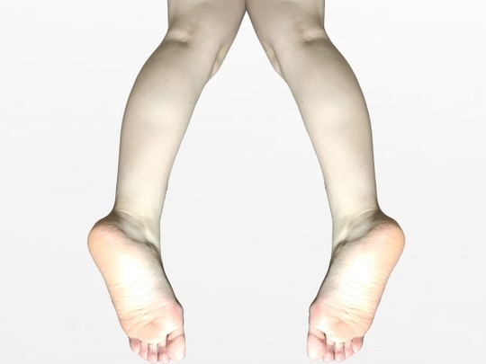 X脚(外反膝)とは、左右の膝の内側を揃えても左右の内くるぶしが接しない状態をいいます。膝が内側を向いている方が多く、歩行時や階段動作で膝に負担がかかりやすくなることがあります。