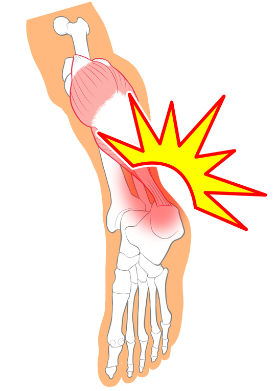 スポーツ動作などの繰り返しにより踵からアキレス腱にかけ負荷がかかりすぎることによって痛みが生じます。アキレス腱自体に炎症が起きて痛みが出るものをアキレス腱炎、アキレス腱周囲に炎症が起きて痛みが出るものをアキレス腱周囲炎といいます。