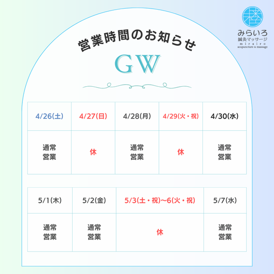 GW後半に予定がある方は、前半のうちに身体のメンテナンスに来て万全な状態で楽しんでください!