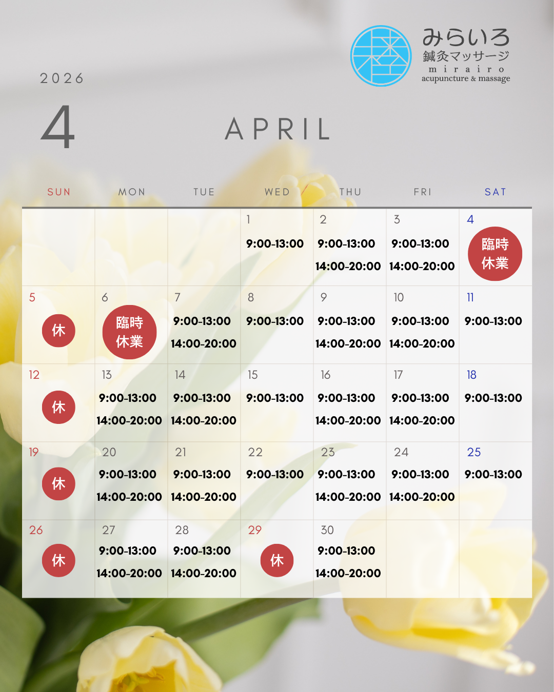 月曜~土曜 9:00〜13:00 / 14:00~20:00